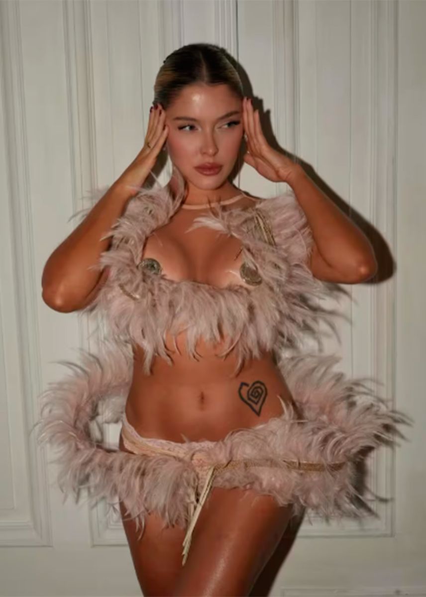El outfit incluyó un top mínimo con apliques metálicos y un recubrimiento de plumas que caía sobre los hombros a modo de capa. En la parte inferior, lució una prenda de encaje en la misma paleta, complementada con un accesorio tipo cinturón con plumas y tiras finas que aportaron volumen y movimiento.