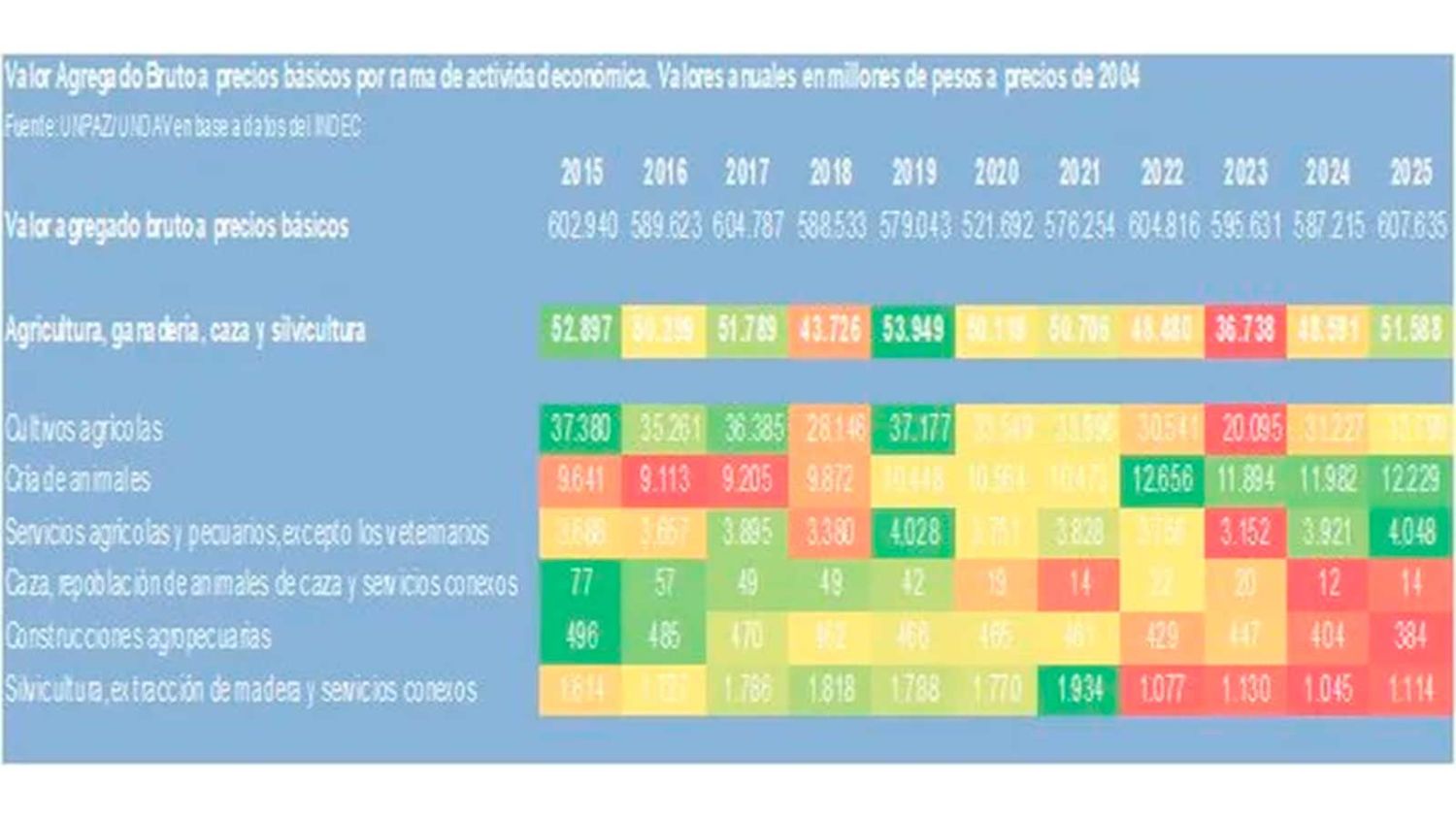 El cuadro del VAB se lee de la siguiente forma, mientras más verde en ese subsector es mayor dato de ese periodo (2015-2025), por ejemplo, el sector agricultura, ganadería, caza y silvicultura tuvo su mayor producción de riqueza en 2019 (se reinstauran las retenciones en 2018), el segundo mejor año fue 2015 (con retenciones), el tercero 2017 (sin retenciones y reducción a la soja gradual). Pero el si comparamos 2015 contra 2025, el agro esta mejor en 2015.