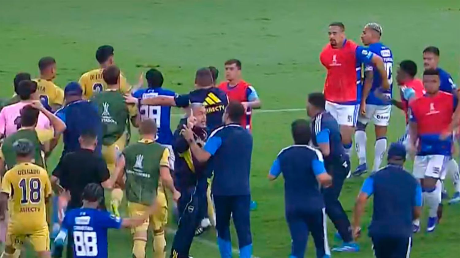 Ese cruce fue el detonante de una batahola generalizada entre ambos planteles, con varios jugadores involucrados, empujones y discusiones que obligaron a intervenir rápidamente para evitar que la situación pasara a mayores.