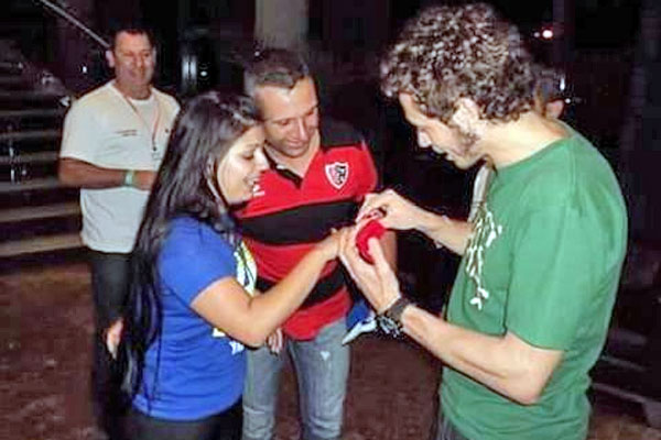 La leyenda viva del MotoGP se convirtió por un instante en oficiante de una ceremonia en el que un muchacho le propuso casamiento a su novia frente al piloto italiano que le puso los anillos.