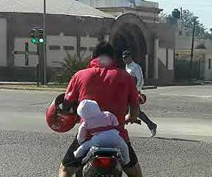 Un motociclista llevaba a un bebé, de pocos meses de vida, atado a su espalda y el casco en la mano. Un acto ineludiblemente grave y repudiable que, seguramente, causó estupor a todas personas que lo vieron en su trayecto.