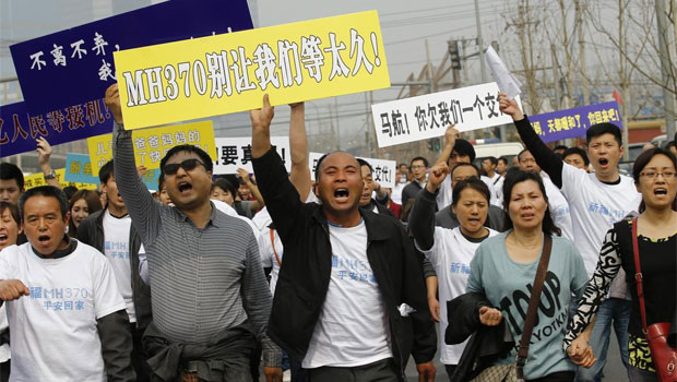 Unos 40 ciudadanos chinos se manifestaron ante la embajada malasia en Pekín con eslóganes como "Malasia, devuélvenos a nuestros seres queridos" y desafiaron a la policía que les impidió acercarse el recinto, según el rotativo singapurense "The Straits Times".