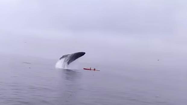 El increíble salto de una ballena de 40 toneladas quedó registrado en video, pero lo espectacular fue que en su caída casi aplasta a una pareja que hacía kayak en el mar.
