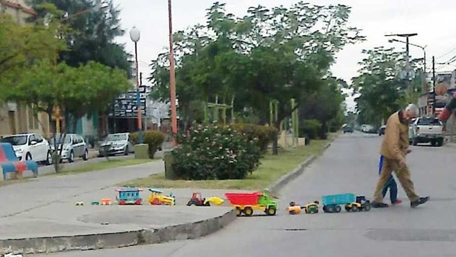 Se trata de un abuelo y su nieto que cruzaban la calle tirando un piolín atado a unos cuantos autitos y camioncitos de juguete.