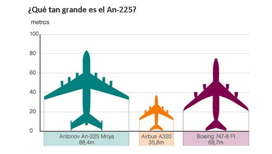 Es el avión más largo, ancho y pesado del mundo. Mide 84 metros de largo, tiene 88 metros de envergadura y pesa 175 toneladas sin cargamento ni combustible.