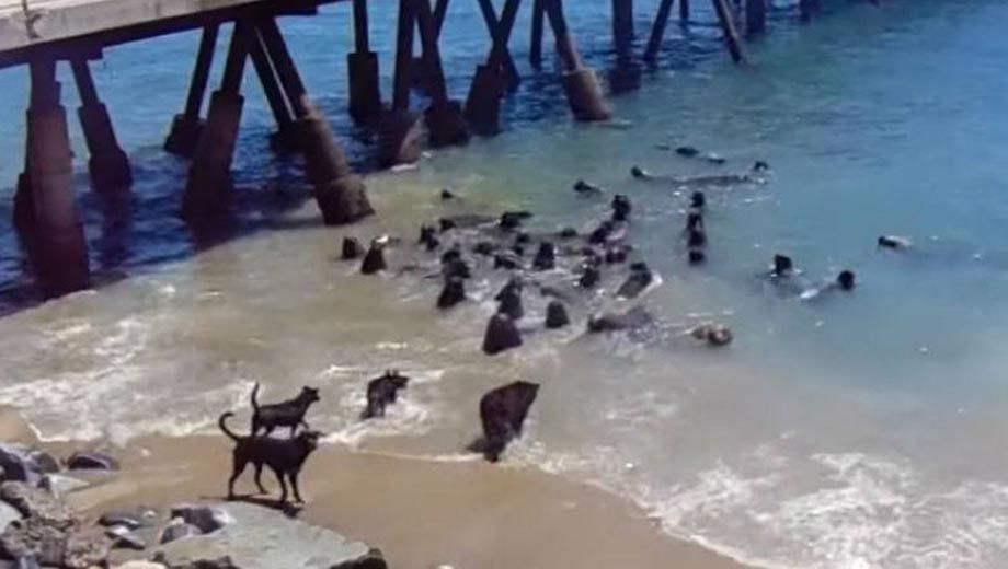 Cuatro perros protagonizaron una curiosa "pelea" con un grupo de lobos marinos y todo fue registrado en un video que ya es furor en las redes sociales.