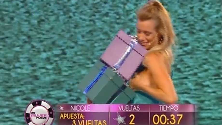 Nicole, que compitió con las parejas de Mariano Pavone, Carolina Molinari, Cinthia Fernández y Matías Defederico, debió correr alrededor de un juego de postas e ir agarrando paquetes. En una de las vueltas, su vestido se corrió y dejó ver por un instante su lola.