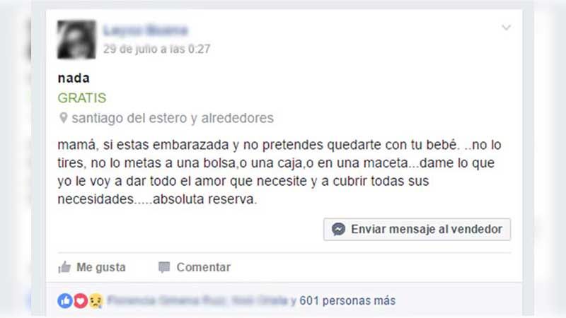 “Mamá, si estas embarazada y no pretendes quedarte con tu bebé, no lo tires, no lo metas a una bolsa,o una caja,o en una maceta. Dámelo, que yo le voy a dar todo el amor que necesite y a cubrir todas sus necesidades.....Absoluta reserva”, relata el mensaje de una mujer del grupo cerrado “Trueque entre nosotras”, dando paso al debate y a la polémica.