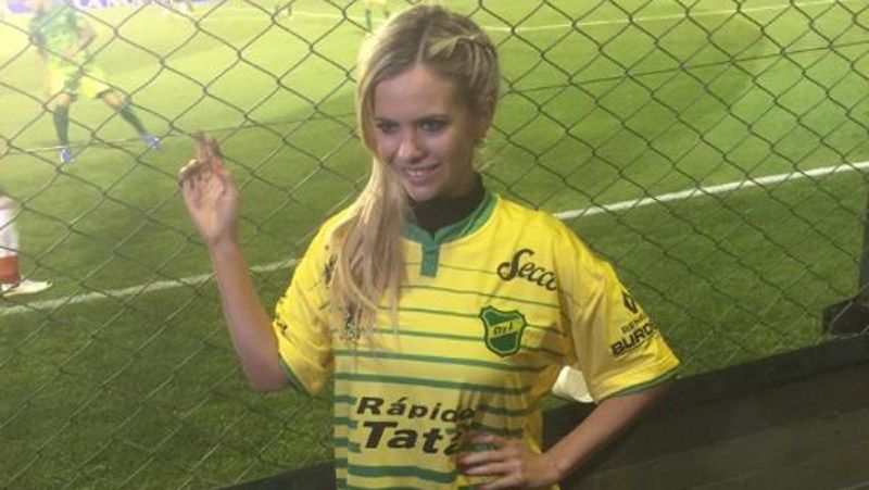 La modelo estuvo en el duelo de Defensa y Justicia, donde juega su pareja Jonás Gutiérrez, ante River y se mostró muy amable con los simpatizantes del “Halcón”.