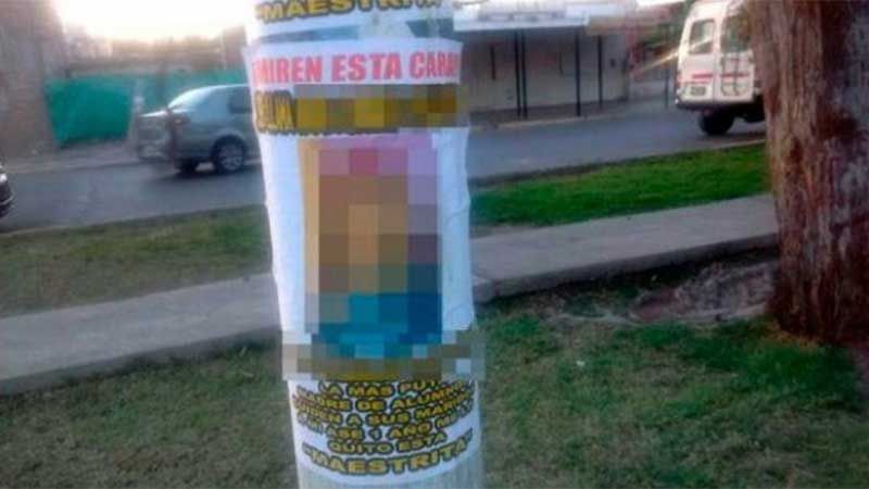 En los afiches, una mujer acusa a una docente de haberle “robado” el marido, con quien tienen un hijo que es alumno de la maestra.