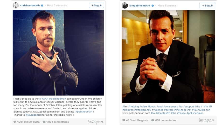 Tanto caras desconocidas de todo el mundo y otras no tanto, como el actor Chris Hemsworth, se han unido ya a la campaña #PolishedMan, en la que ya han participado más de 35.000 hombres. Aunque cualquier persona que quiera, ya sea hombre o mujer, puede unirse a esta iniciativa, principalmente está dirigida a hombres al ser el colectivo por distinción de género con más implicaciones en tan reprochables conductas. Que únicamente luzcan una uña pintada tiene una una explicación tanto o más lógica.