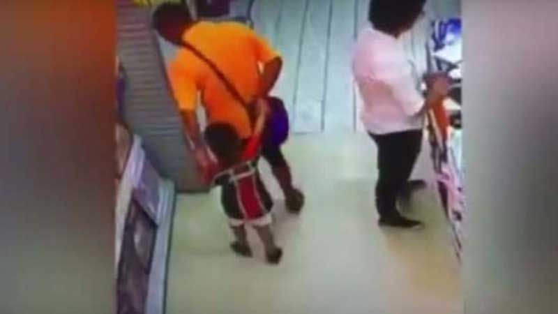 En este momento, el hombre pierde el equilibrio y cae pesadamente sobre el menor. Una clienta corre a socorrer al niño, quien queda sumamente dañado por el impacto.