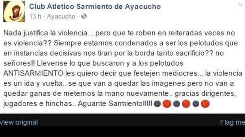 En otra actitud increíble por parte de Sarmiento, desde el club intentaron justificar la golpiza. En la página oficial de Facebook escribieron un comunicado lamentable en el que aludieron que verse perjudicados por los árbitros también es violencia. El mensaje fue borrado horas más tarde.