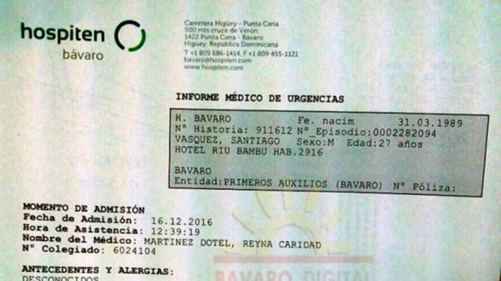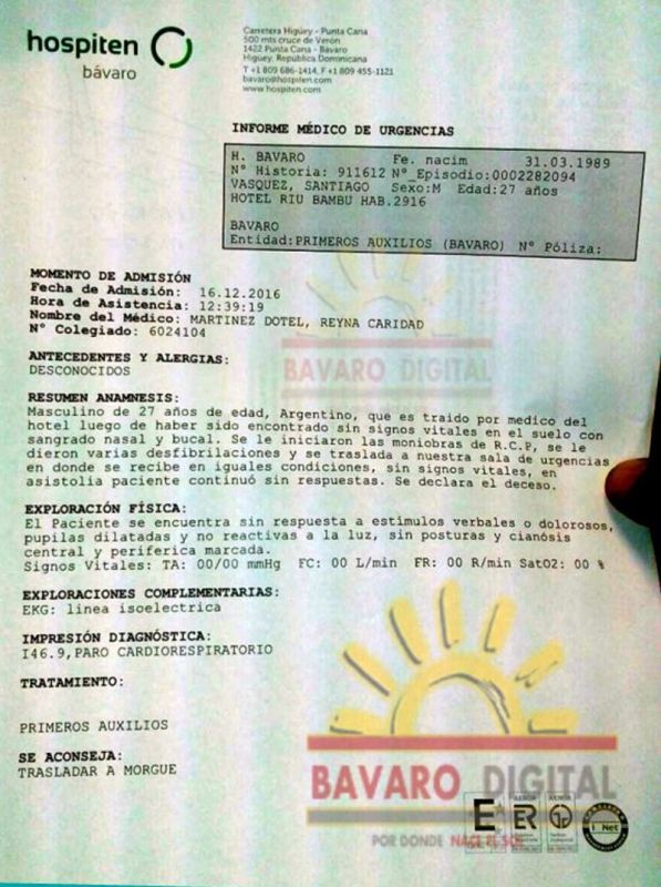 "Masculino de 27 años de edad, argentino, que es traído por el médico del hotel luego de haber sido encontrado sin signos vitales en el suelo con sangrado nasal y bucal. Se le realizaron las maniobras de RCP, se le dieron varias desfibrilaciones y se traslada a nuestra sala de urgencias en donde se recibe en iguales condiciones, sin signos vitales, en asistolia paciente continuó sin respuestas. Se declara el deceso", asegura el informe que emitió el centro de salud Hospiten Bávaro de Punta Cana que difundió el sitio Bavaro Digital.