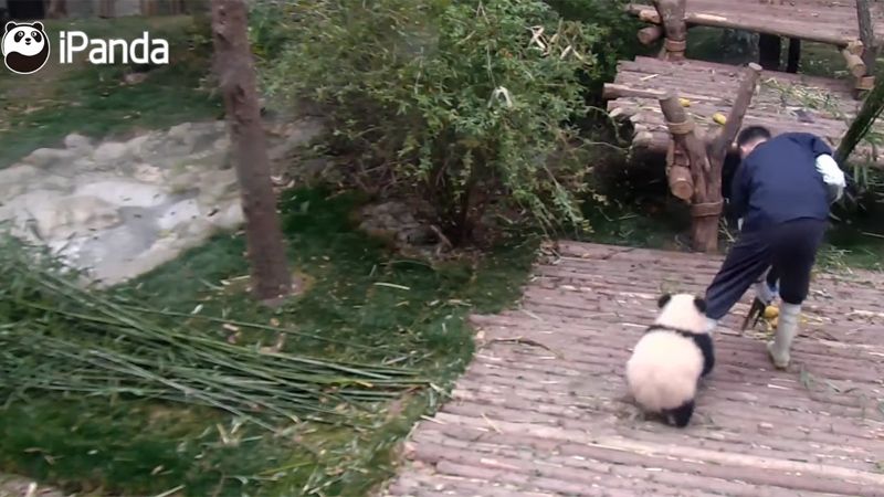 Tal y como se puede ver en las imágenes, el cuidador trata de limpiar el espacio en el que viven los osos pero la cría de panda no le permite hacerlo.