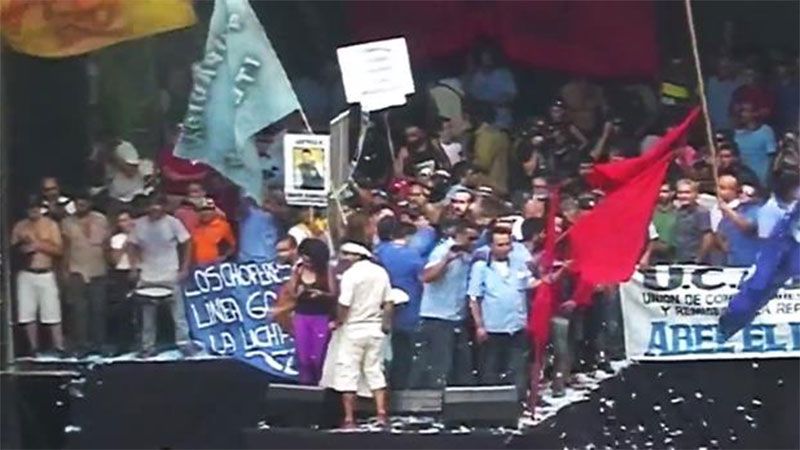 ¿Quiénes fueron los que coparon el escenario y pidieron que se defina una fecha de paro? Según se pudo observar en transmisiones televisivas, los manifestantes tenían banderas ligadas a la línea 60. También una bandera naranja de Villa La Ñata, el club donde juega al fútbol el ex gobernador Daniel Scioli, quien estuvo en la marcha.