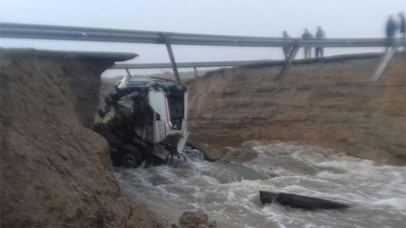 En el caso de la Ruta 3, una enorme grieta de unos cinco metros se abrió a la altura del Km 1673, cerca de Garayalde, y la cabina de un camión cayó en ella sin que por ahora se conozcan datos oficiales sobre el estado de salud del conductor.