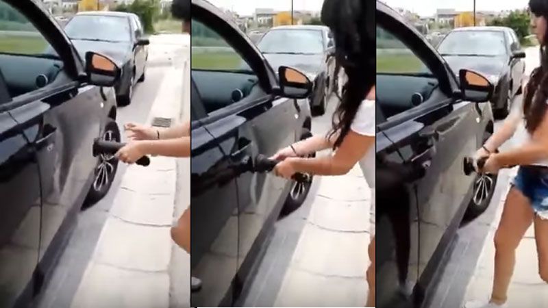 El auto de la joven tenía un golpe en la puerta del acompañante. Sus amigos graban mientras ella hacer desaparecer el golpe.