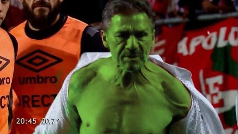 El técnico del Pincha descargó su bronca contra su camisa y la comparación con el Increíble Hulk no hizo esperar. Además, el DT arrojó una patada que ridiculizó más su escena al perder un zapato.