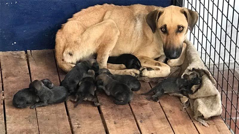 Se trata de una perra callejera que está con un estado de desnutrición avanzado, y aún así quedó preñada en su último celo, y producto de eso tuvo nueve cachorritos. Sin embargo, la pobre madre no está físicamente preparada para producir leche, ni mucho menos tiene fuerza para alimentar a sus crías.