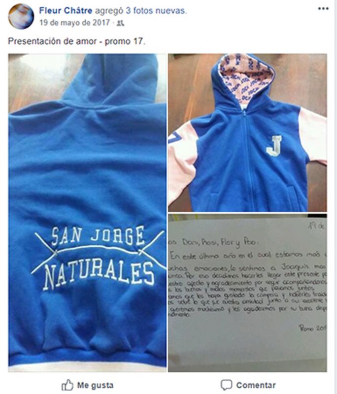 Joaquín Castro Menéndez estuvo presente en el homenaje que organizaron sus compañeros del colegio San Jorge, en el que invitaron a sus familiares y les entregaron su campera.