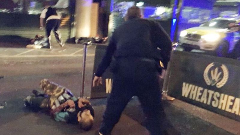 El presunto atacante fue mostrado en el suelo, en las afueras del pub Wheatsheaf en Borough Market, muy cerca del Puente de Londres. En la fotografía se podía ver a otro hombre tendido en el suelo a corta distancia.