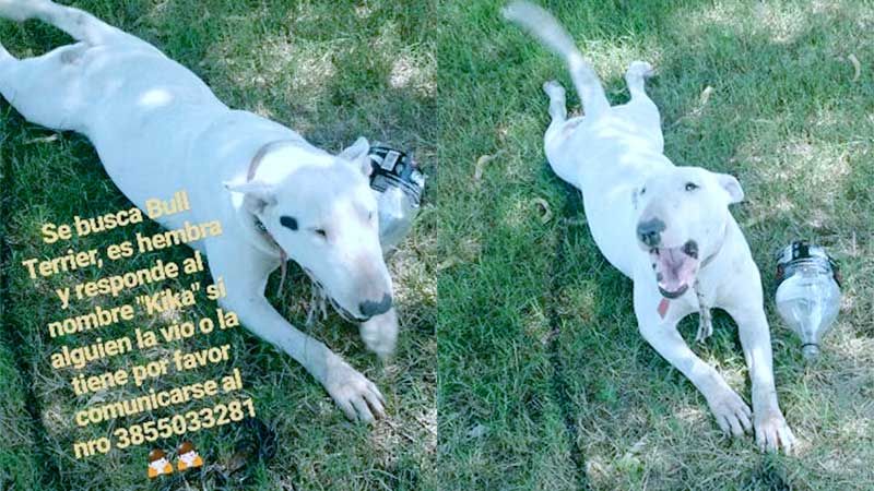 Esta hermosa bull terrier responde al nombre de Kika, y su familia la está buscando desesperadamente porque aseguran que alguien la levantó por error, en la zona de Los Flores, en Camino a la Costa y Canal.