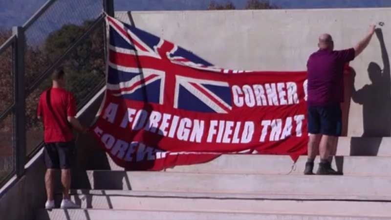 "Hay un rincón de tierra extranjera que es para siempre de Inglaterra", decía la bandera de los fanáticos europeos en alusión a las Islas Malvinas.