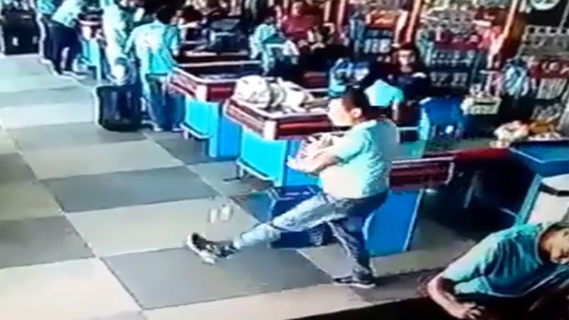 El divertido momento fue captado por las cámaras de seguridad. El hombre resuelve un imprevisto con gran talento.