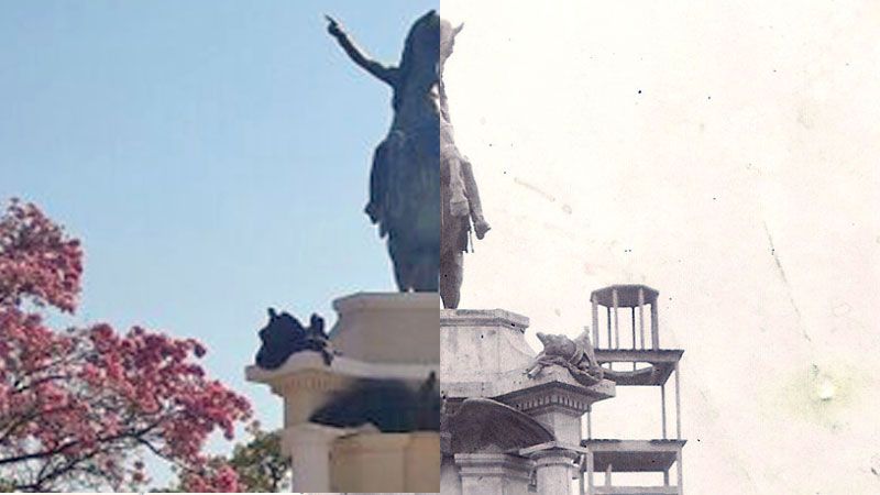 En la imagen del antes y el después se puede observar a un grupo de personas posando en una de las barandas y en el fondo se nota una estatua de Francisco de Aguirre en construcción. La imagen pertenece a la década del 70.