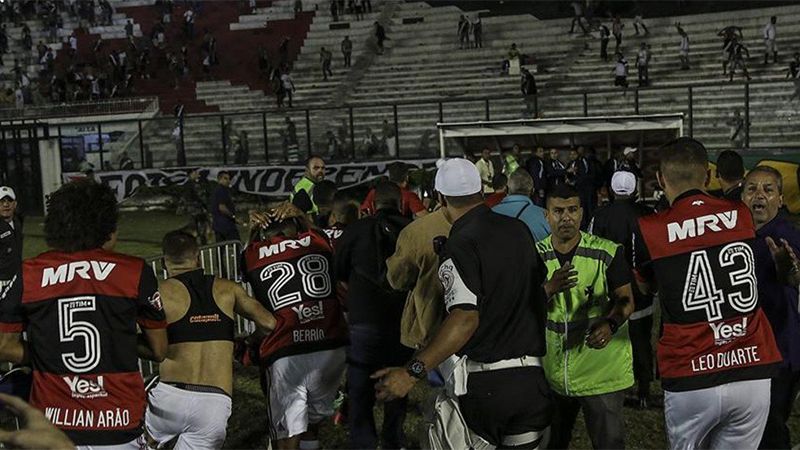 Parte de los aficionados lanzaron todo tipo de objetos, incluyendo bombas caseras, al césped e impidieron que los jugadores del Flamengo y los árbitros pudieran entrar al túnel de vestuarios.
