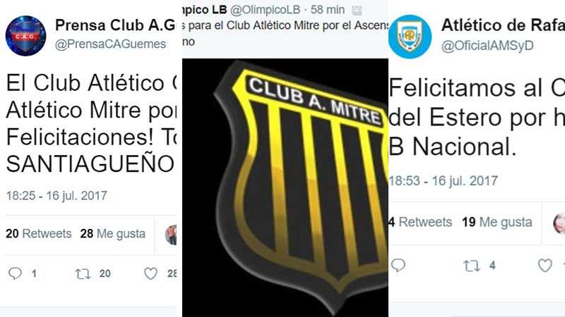 — C. A. Sarmiento (@SarmientoLB) 16 de julio de 2017Felicidades a @CLUBAMITRE por el ascenso a la Primera B Nacional. Gracias por dejar bien alto el fútbol santiagueño.