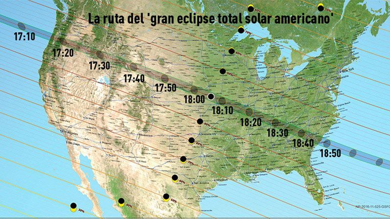 Según la NASA, este espectáculo será visible en catorce estados: Oregón, Idaho, Wyoming, Montana, Nebraska, Iowa, Kansas, Missouri, Illinois, Kentucky, Tennessee, Georgia y Carolina del Norte y del Sur. Depende en que punto esté la persona, los científicos de la agencia resaltaron que el eclipse se podrá contemplar durante un máximo de dos minutos y 41,6 segundos. Los que podrán observarlo por más tiempo serán los que estén al sur de la localidad de Carbondale, en Illinois, y las ciudades céntricas de Kentucky.