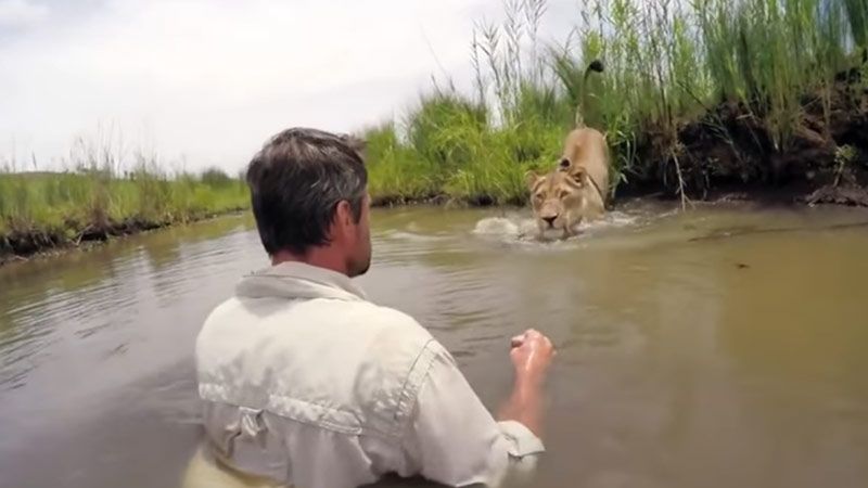 Este experto protagoniza un video en el se le ve en una charca de agua mientras una enorme leona se le acerca poco a poco y finalmente salta sobre él desde la orilla.