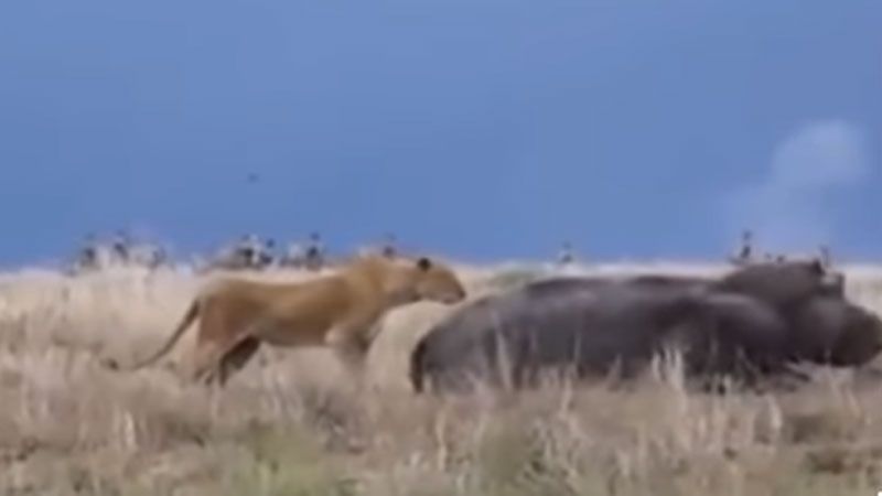 Lo que parecía una presa fácil para la leona casi termina en su propia muerte. El felino vio que un hipopótamo descansaba plácidamente y se acercó y lo tanteó por detrás, como preparándose para devorarlo.