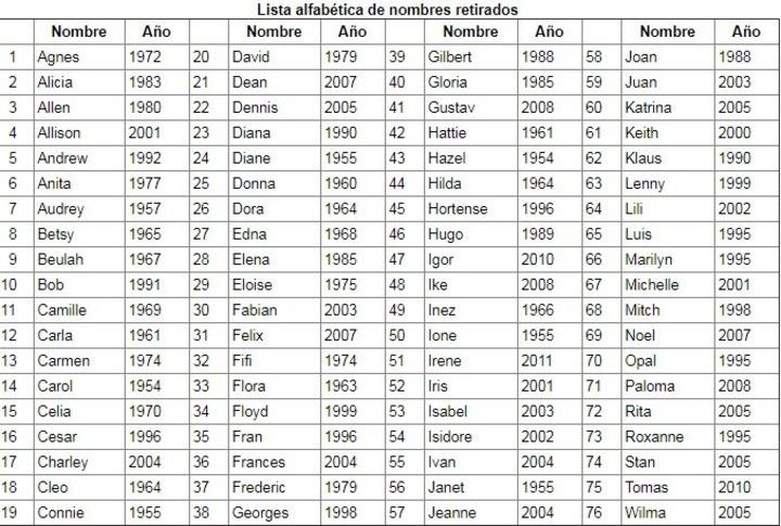 “Es una práctica que se hace desde 1953. Al principio sólo se elegían nombres de mujeres, pero desde 1978 también se utilizan nombres de hombres. Cualquier nombre de un huracán que haya producido muchas pérdidas de personas o económicas ellos lo jubilan, deciden no utilizarlo más. Por ejemplo, nunca más habrá un huracán que se llame Katrina” (que causó cerca de 2.000 muertos en Nueva Orleans y el sur de Estados Unidos en 2005).