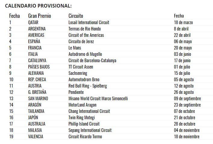 El calendario del año próximo del Mundial de MotoGP está previsto que comience el fin de semana del 18 de marzo en Qatar y termine el 22 de noviembe en Valencia.