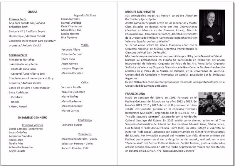 Este evento contará con la presencia del destacado violinista Buchhalter Miguel, actualmente solista y preparador técnico de la orquesta sinfónica de la Unse y del novel guitarrista Franco Luna.