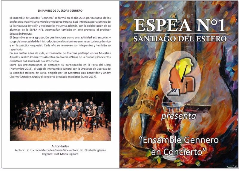 La rectoría de la ESPEA Nº1 “Nicolás Segundo Género”, invita a la comunidad santiagueña a participar del concierto que brindará el Ensamble Género, que interpretará obras de diversos periodos.
