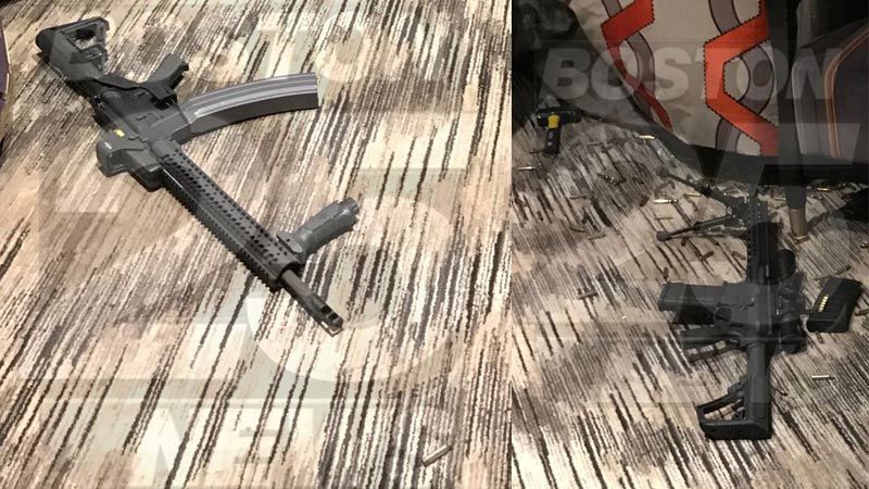 Las fotos, obtenidas por la cadena Boston 25 News, muestran a dos rifles, uno de ellos con una mira telescópica incorporada. La ventana del piso 32 del hotel Mandalay Bay estaba a unos 400 metros de la multitud que disfrutaba de la última noche de un festival de música country.