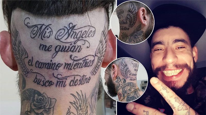 Fanático de los tatuajes, Ulises Bueno (32) compartió en Instagram una serie de fotos del tremendo tatuaje que se hizo en su nuca, para lo cual debió raparse el pelo de la zona. En la primera imagen que posteó el hermano menor del Potro Rodrigo se aprecia la frase que eligió inmortalizar en su cuerpo: "Mis ángeles me guian el camino mientras busco mi destino".