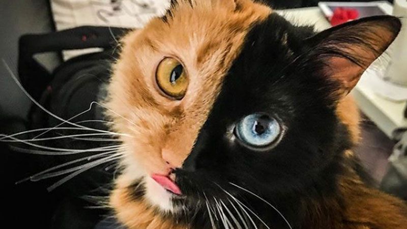 Parece Photoshop, pero no lo es. La especie existe en Argentina, y se convirtió en furor debido a su excepcional aspecto, dividido en dos grandes partes: de un lado el pelaje negro con ojos azules, y del otro anaranjado con ojos verdes. ¡Increíble!