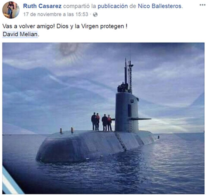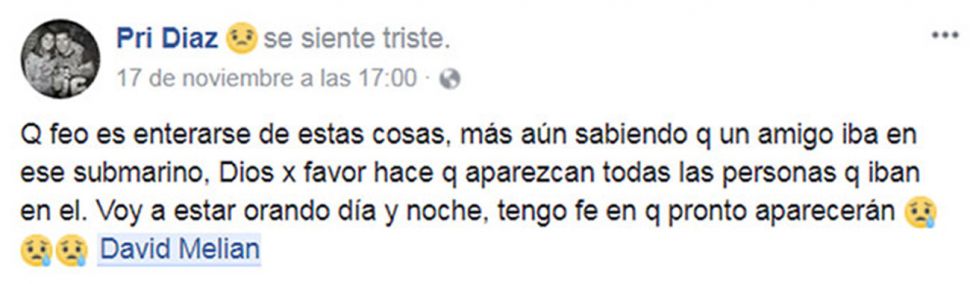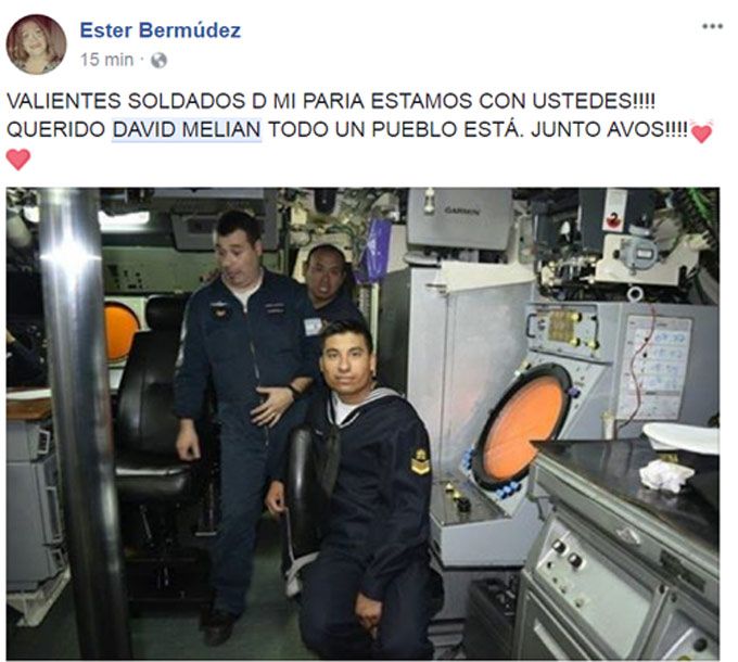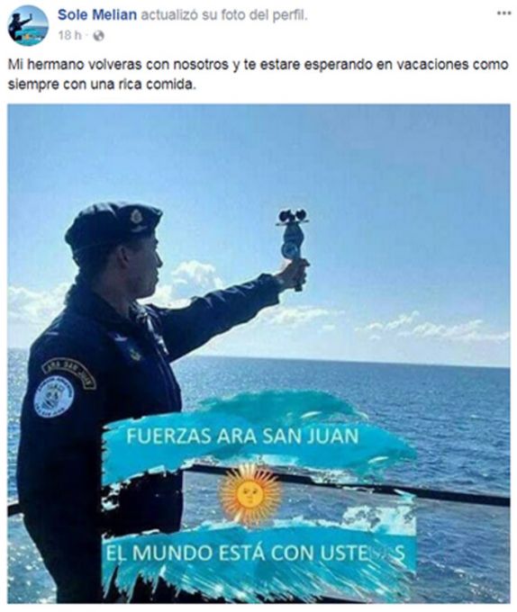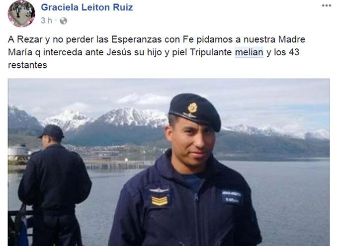 Muchas personas, entre ellas familiares y amigos, expresaron en Facebook su deseo de que pronto haya novedades del santiagueño y los otros 43 tripulantes.