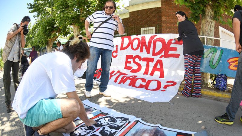 Acompañaron a la familia militantes de organismos de derechos humanos, que colocaron en la puerta de la cochería una bandera con la cara de Santiago y carteles con las leyendas: "Justicia" y "No me olviden".