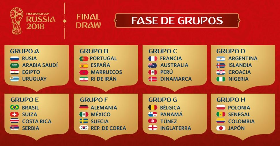Programa de partidos, con sedes y horario argentino, del Mundial Rusia 2018, realizado hoy el sorteo de la primera fase en la ciudad de Moscú.