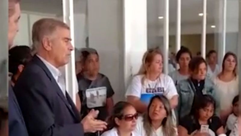 Al ministro Aguad casi no se lo podía escuchar entre las voces del reclamo. Y el ambiente terminó de empeorar cuando otra mujer le dijo: "La Armada dice que no abandona a sus marinos. Cortando el rescate, están abandonando a los marinos. O usted quiere que me vaya al medio de mar a buscarlo para llorarlo".