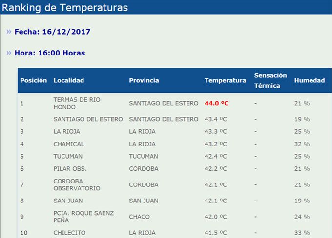 Luego, muy de cerca, le siguieron dos de La Rioja, la capital (43,3 ºC) y la localidad de Chimical (43.2 ºC) ; y en quinto lugar San Miguel de Tucumán (42,4 ºC).