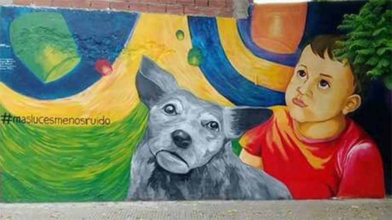 Muralistas locales junto a la asociación Cedes Kaizen pintaron un mural en alusión a lo que sufren los animales y los niños con autismo a causa de los estruendos.