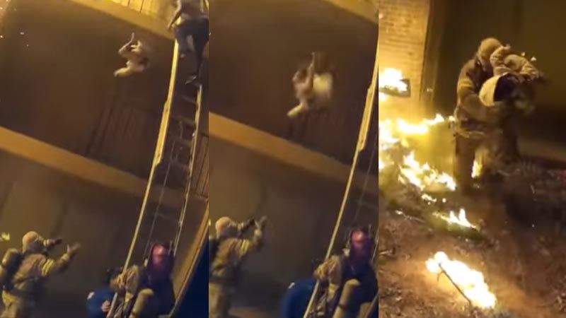 El video muestra cómo la mujer logró salvar la vida de la niña que fue arrojada por la ventana por su padre para salvarla de las llamas.