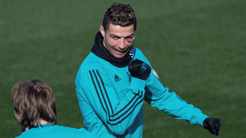 Cristiano Ronaldo completó el último entrenamiento en la ciudad deportiva del Real Madrid antes del duelo de Copa del Rey ante el Leganés, para el que le reservará Zinedine Zidane, pese a tener su ojo izquierdo hinchado y morado, con los puntos que recibió tapados tras el golpe sufrido el domingo.